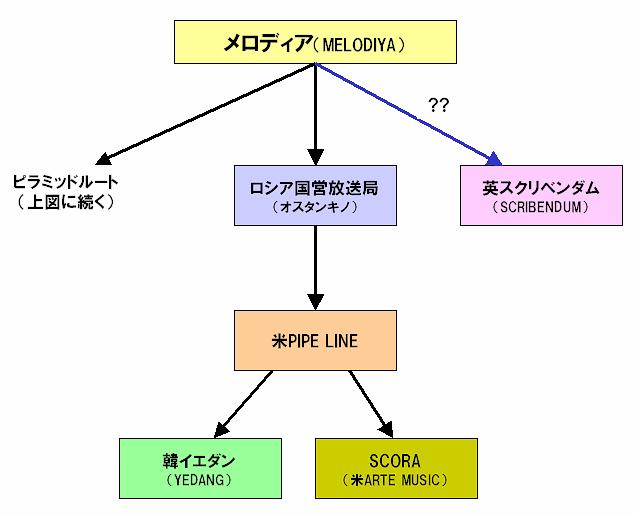 イエダン(YEDANG)やスコラ(SCORA)は、ロシア国営放送局(オスタンキノ)が持っている音源を米PIPELINEが権利取得