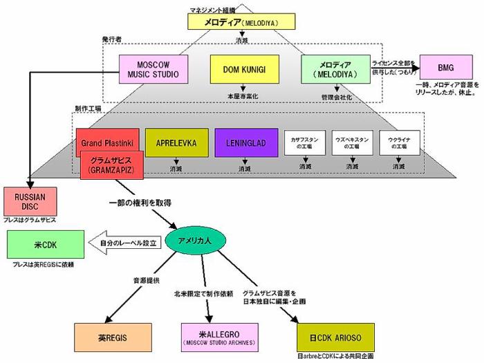| 話し手:グラムザピス社長Mazin氏 聞き手:ゆたかさん 99年12月面談 ●ソ連時代のLPやCDの発行はすべて文化省の管轄で、その下に右のようなピラミッド構造があった。 (1)ピラミッドの頂点に全体のマネジメント組織としてのメロディア(MELODIYA) (2)その下に、発行者として次の3つの組織。 ・MELODIYA ・DOM KUNIGI ・MOSCOW MUSIC STUDIO (3)その下に制作工場。 (ロシアに3ヵ所、およびカザフスタン、ウズベキスタン、ウクライナにあった) ロシアにあった3つの制作工場は下記の通り。 ・Grand Plastinki (現在のグラムザピス) ・APRELEVKA ・LENINGLAD (4)さらにその下に、小売組織。 すべて国営で、本屋チエーンや外人専用土産物屋=ベリオスカやキオスクなど ![]() ●毎年、小売組織からの希望を聞いて、発行者でそれを話し合い、その結果をマネジメント組織のメロディアから文化省に 上げて予算を割り当ててもらい、録音を発行者が行い、プレスを制作工場が行っていた。 したがって、ソ連時代のレコードのレーベルはほとんどがメロディアであったが、中にはDOM KUNIGIやMOSCOW MUSIC STUDIOレーベルで出回ることもあった。 ●91年のソ連崩壊後、これらの組織も民営化されたが、ピラミッド構造は残さず、それぞれの階層で横に輪切りにし、 その後、縦に切って細分化したものだから、現在の混乱を招くことになった。 ●マネジメント組織であるメロディアも民営化したが、何も持っているわけではなく、売る物もないため自然消滅した。 ●発行者の3社のうち、DOM KUNIGIは本屋専業となり、音盤のリリースは取りやめた。 MOSCOW MUSIC STUDIOは「RUSSIAN DISK」と名前を変え、アメリカ資本とJ/Vを組み、レコード出版会社として存続し 現在に至る(この「RUSSIAN DISK」は、昔、紫色のジャケットでスクリャービン全集などをリリースしていたの「RUSSIAN DISC」のことと思われ、その後、ジャケットデザインを一新し、ミャスコフスキー全集などをリリースしている現在のレーベ ルとして存続中と思われる。) 発行者のMELODIYAは所有している(と思っていた)版権を全部、BMGにライセンスし、自身はライセンス管理会社として 社員4名でかろうじて存続。 ●制作工場のうちカザフスタン、ウズベキスタン、ウクライナの3工場は消滅、LENINGLADもちょっとがんばったが倒産、 APRELEVKAはアメリカ資本と合弁して1〜2年レコード制作を行っていたが消滅、残ったGrand Plastinkiが国営工場として 当初、発行者のメロディアの下請けとしてCDを制作していたが(アンソロジーシリーズの多くはGrand Plastinkiでプレスされ たのだろう)、メロディアが、BMGに版権を売った後、独自にCDをリリースし始めた。 ●発行者のメロディアは、「音源の権利は自分にある」と主張して、BMGにライセンスしたが、後になって、版権はまだ国に 残っていたことが判明した(メロディアからライセンスを買ったBMGは詐欺にあったようなもの) ●グラムザピスは国営会社であったため、文化省の傘下として堂々とCDを制作、自分のレーベルで販売できた。 またRUSSIAN DISCのCDのプレスもほとんどグラムザピスが請け負っているとのこと。 |